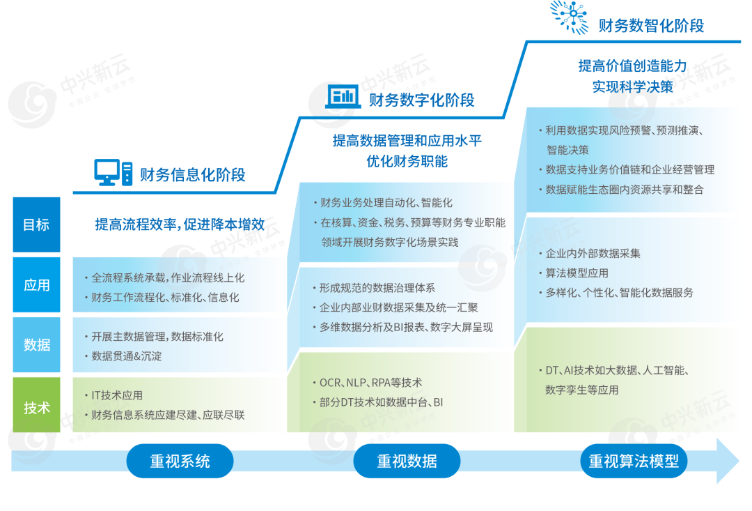 从财务信息化到财务数智化,企业通常要经历从信息化到数字化、再到数智化的两次关键飞跃。