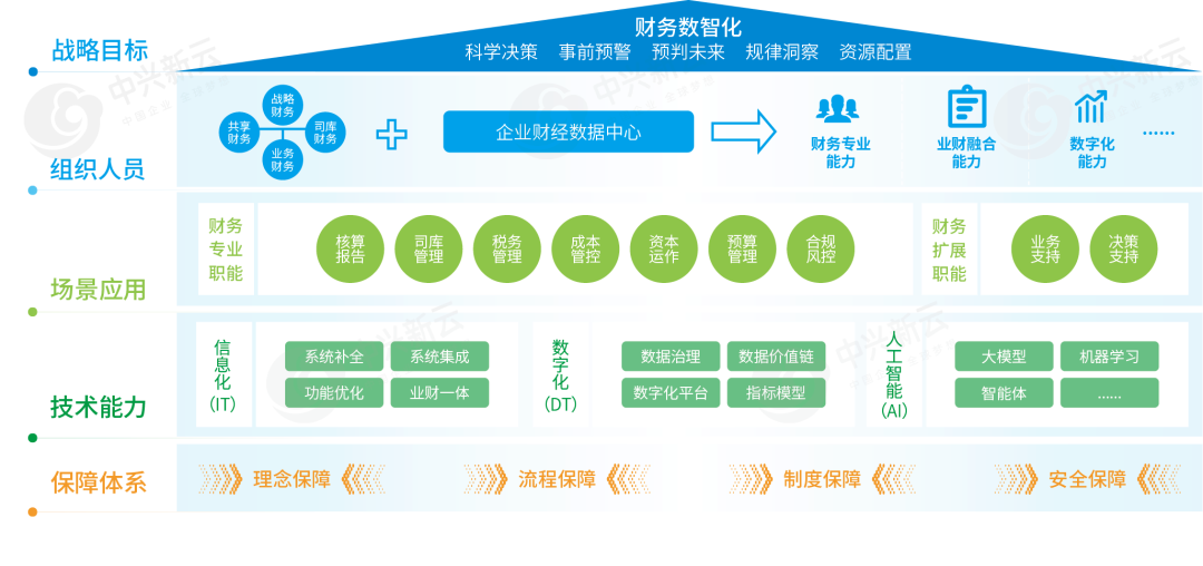 为推进财务数智化转型的落地,企业需确立一个统领全程的系统性顶层框架。我们将此框架总结为五大核心要素,其中战略目标作为顶层指引,明确转型愿景;组织人员确保转型所需的能力支撑与责任主体;场景应用聚焦价值实现,形成具体的业务解决方案;技术能力通过前沿技术的应用,驱动财务管理模式创新;保障体系为转型顺利推进提供必要支撑。