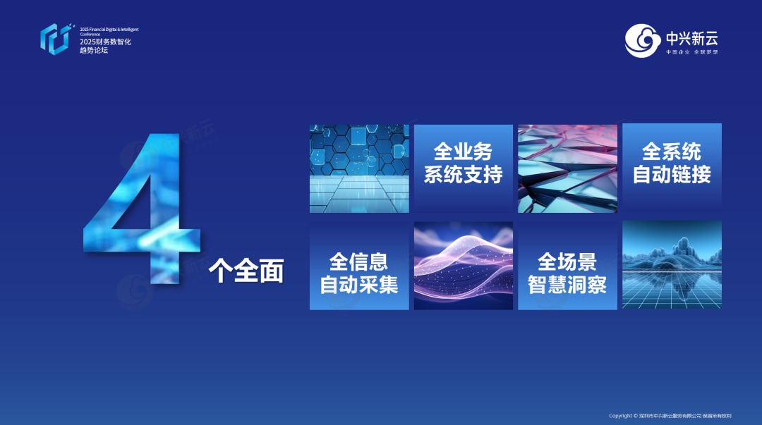 最后是“4个全面”,它描绘了未来财务工作的核心特征:全业务系统支持、全系统自动连接、全信息自动采集、全场景智慧洞察。