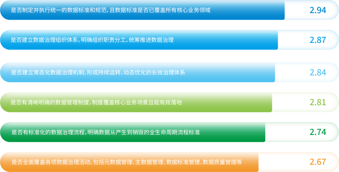 调研显示,企业在数据治理各个维度的平均得分均低于3分,其中按照平均得分从高到底排序为数据标准制定与执行(2.94分)、数据治理组织体系(2.87分)、常态化数据治理机制(2.84分)、数据管理制度(2.81分)、标准化数据治理流程(2.74分)、全面覆盖数据治理活动(2.67分)。这一结果说明,当前企业虽然在数据治理体系建设方面已初步开展工作,但整体成熟度仍然偏低,尤其在数据治理流程的标准化,及数据治理活动的全面性上表现薄弱。