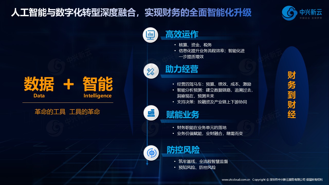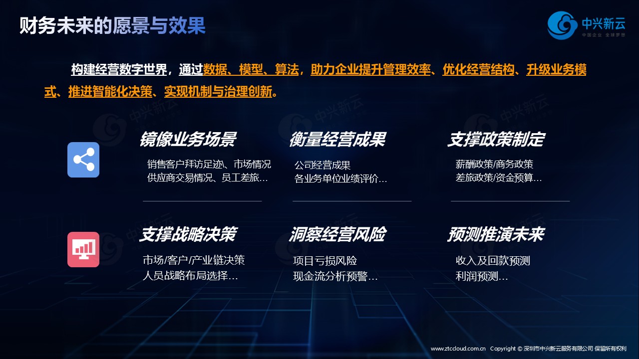 未来的财务一定是智慧的财务,助力企业提升效率、优化经营结构、升级业务模式,推动智能化决策和管理,通过数据镜像业务场景、衡量经营成果、支撑政策制定与战略决策,并有效洞察风险、预测未来。
