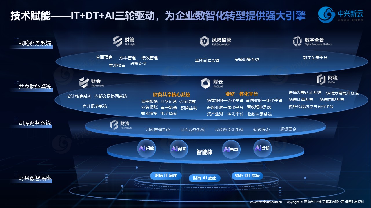 在工具与技术平台方面,以“IT+DT+AI”三轮驱动提供全面支撑。中兴新云信息系统应用分三层:司库财务系统、共享财务系统、战略财务系统;构建七条产品线——财云、财会、财资、财税、财管、风险监管、数字全景,全面支撑财务转型落地。同时三大技术底座承载:财信(IT底座)、财芯(数据底座)、财智(AI底座)。