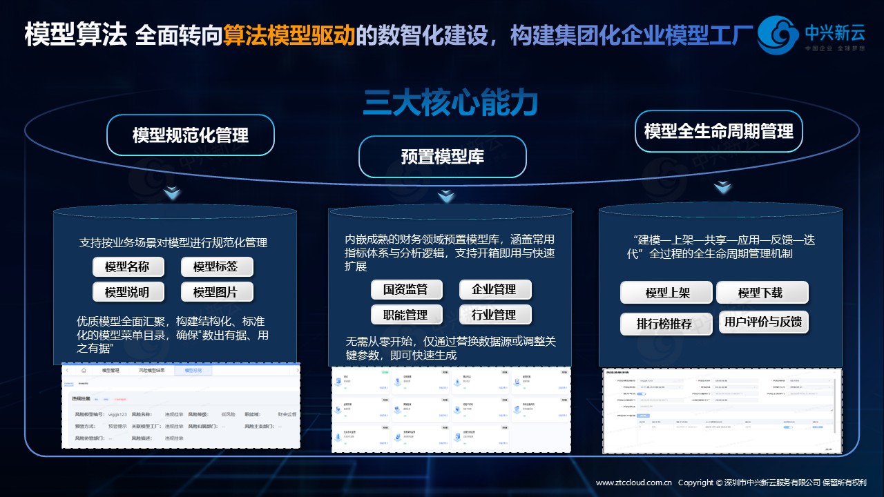 在模型与算法层面,我们致力于推动决策从流程驱动转向数据驱动,从依赖经验判断转向依托模型与算法支撑。在数智化落地实践中,中兴新云与客户共同构建企业集团化模型工厂,针对高价值业务场景,实现模型的规范化管理、预制模型库构建及全生命周期管理。目前,围绕国资监管、八项规定、三资一付、业绩考核、企业管理及财务职能等重点领域,已建立了近千个模型,赋能各类企业与行业应用。