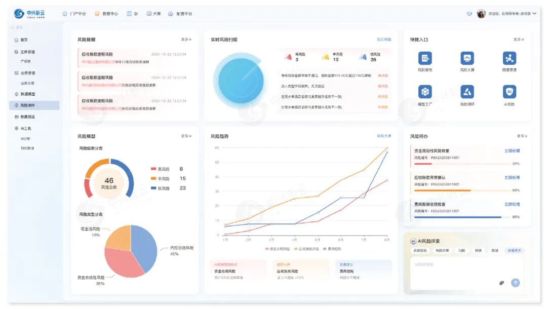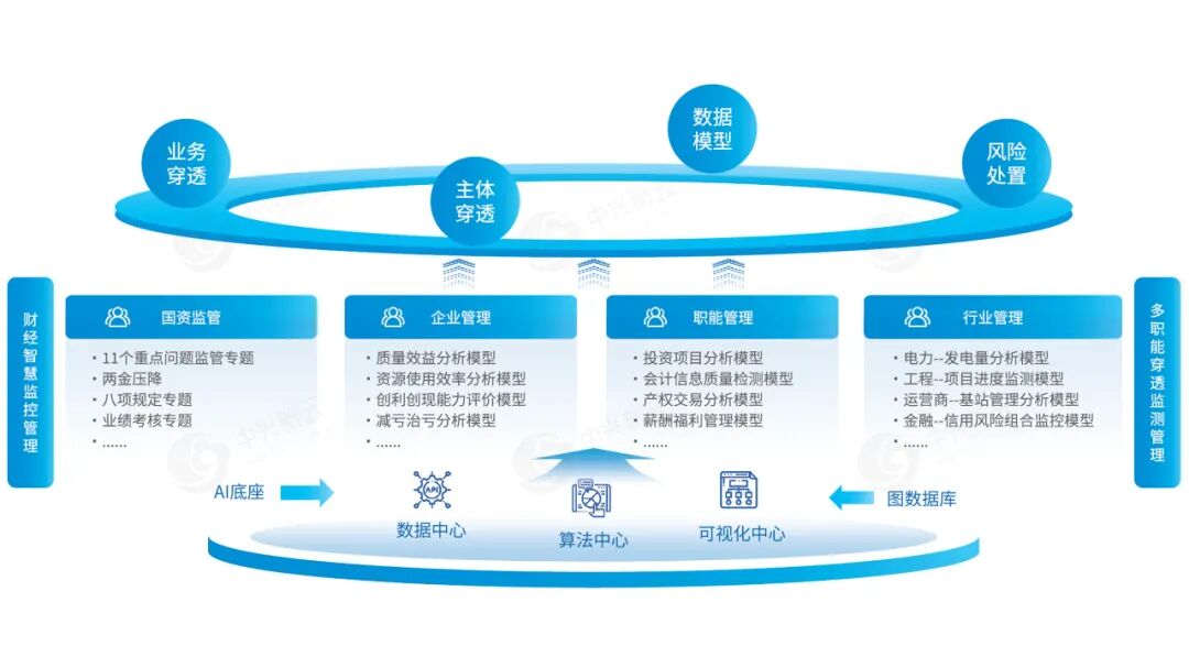中兴新云穿透式监管解决方案以主体、业务、数据、风险四大穿透为核心,依托数据中心、算法中心、可视化中心及AI与图数据库,构建覆盖国资监管、企业管理等重点场景的数百个指标模型,动态感知风险,精准量化分析,筑牢企业高质量发展的内控合规根基。