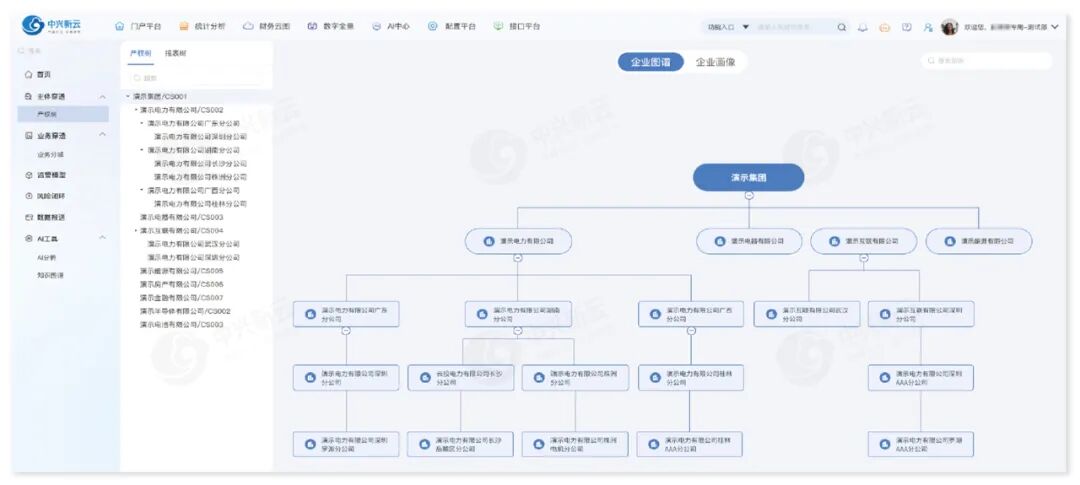 系统基于对财务、业务及外部多源异构数据的全量、全级次采集,通过产权树、报表树等穿透式可视化形式,高效实现对业财数据、产权数据、报表数据、产业布局和产业发展数据、薪酬分配数据的全级次监管。