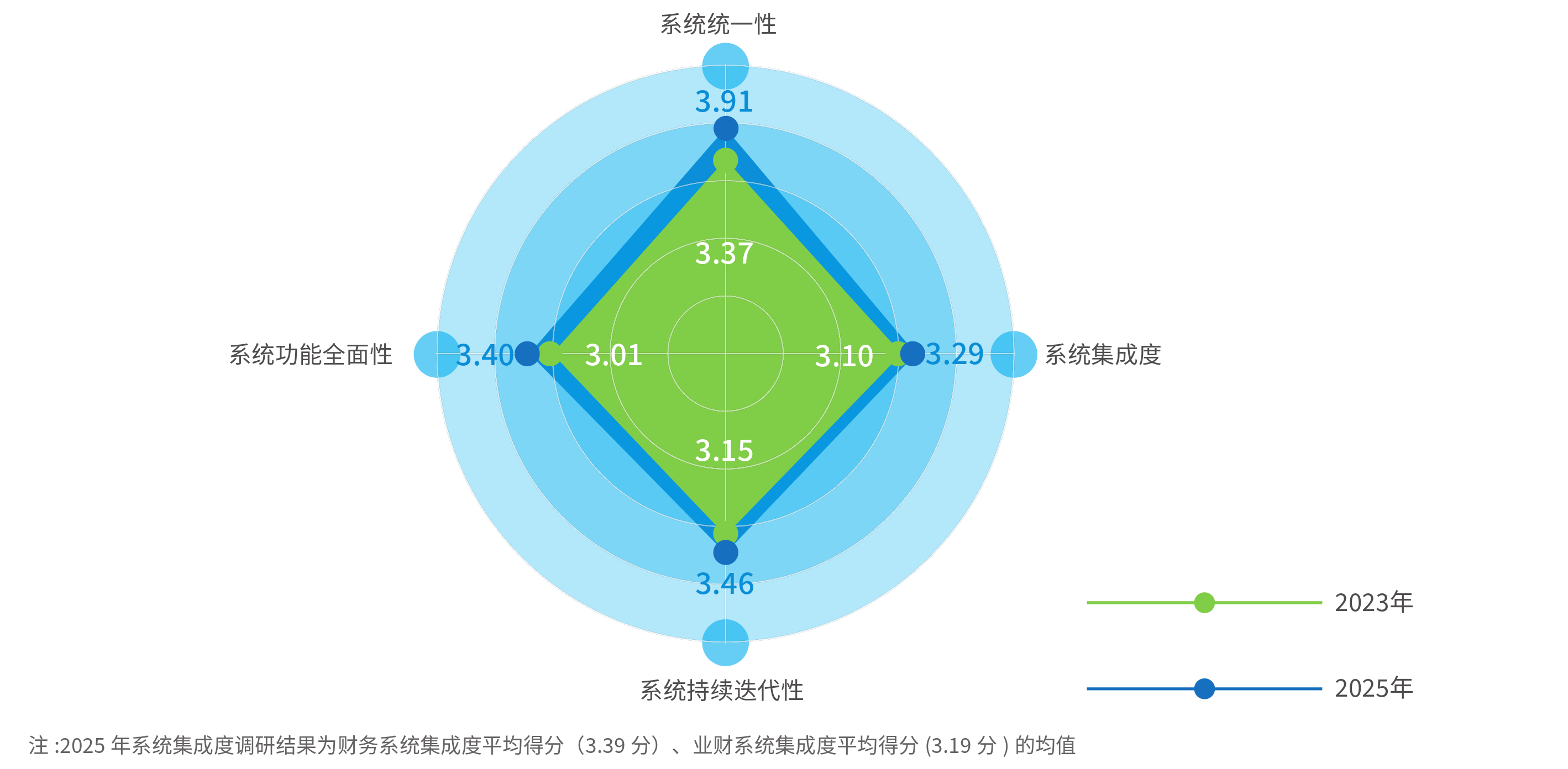 针对企业财务信息系统在系统统一性、系统功能全面性、财务系统集成度、业财系统集成度、系统持续迭代性五个维度的评价中,受调研企业整体平均得分为3.47分,较2023年的3.13分提升0.34分,这表明企业正加速推进财务信息系统的迭代升级与互联互通,其中,“系统统一性”表现最优(平均得分3.91分),“业财系统集成度”表现相对较弱(平均得分3.19分),说明打通业财壁垒,实现数据与流程的端到端协同仍是企业信息化的短板。