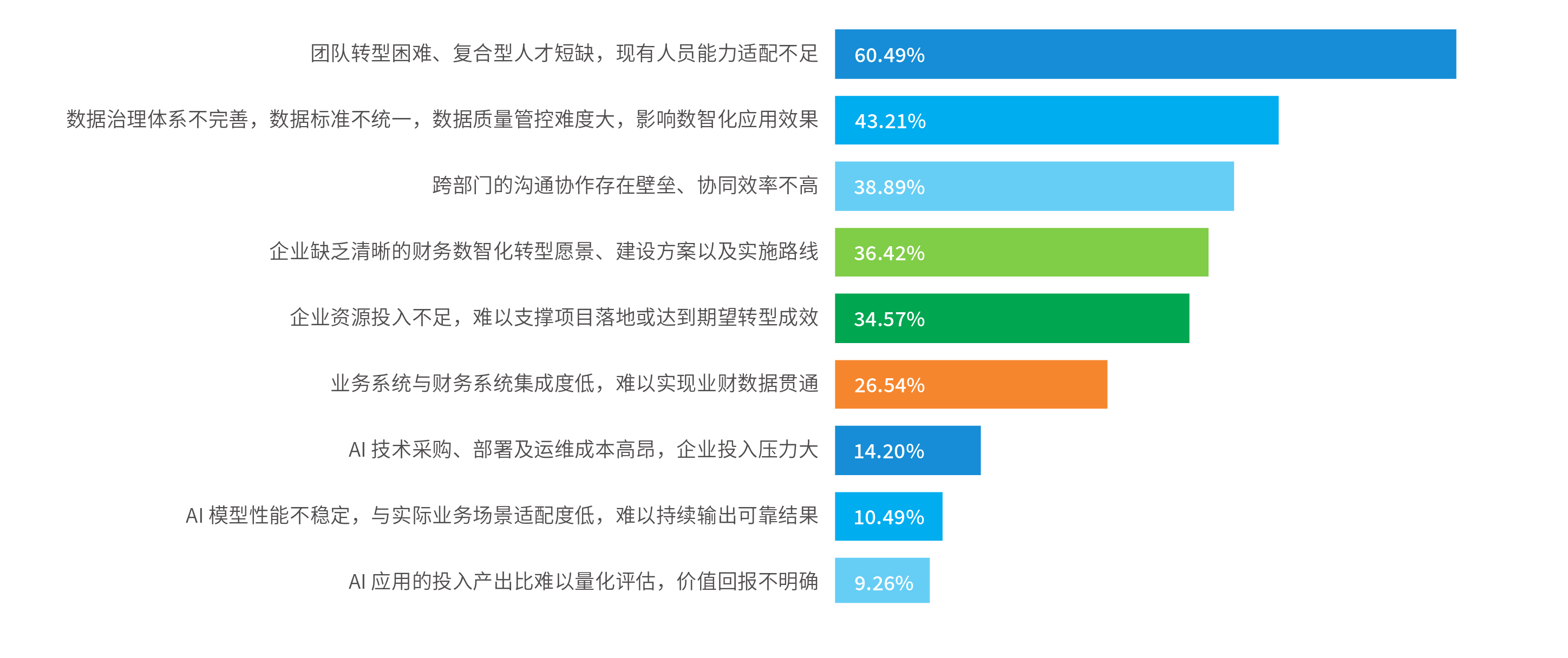 调研显示,60.49%的企业将“复合型人才短缺”列为最大挑战,43.21%的企业指出“数据治理体系不完善”,38.89%的企业提及“跨部门协作不畅”。这三类瓶颈充分说明,财务数智化转型远非单纯的技术引入,而是一场涉及组织、人才、数据与协同机制的系统性变革,企业需要加强顶层设计与统筹推进,确保财务数智化转型从规划走向落地。