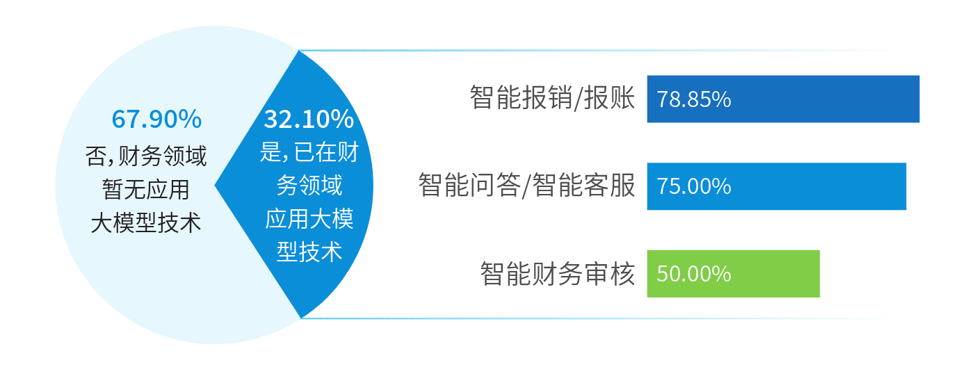 作为一项突破性技术,大模型在财务领域的应用正呈现快速起步态势。调研显示,已有32.10%的企业在财务工作中开展大模型技术实践,反映出该技术已从概念验证阶段进入规模化应用的初期。从落地场景来看,当前应用主要集中在智能报销/报账(78.85%)、智能问答/智能客服(75.00%)和智能财务审核(50.00%)等交互与审核类环节,说明企业正通过低风险、高频率的场景积累技术使用经验,为后续深化应用奠定基础。