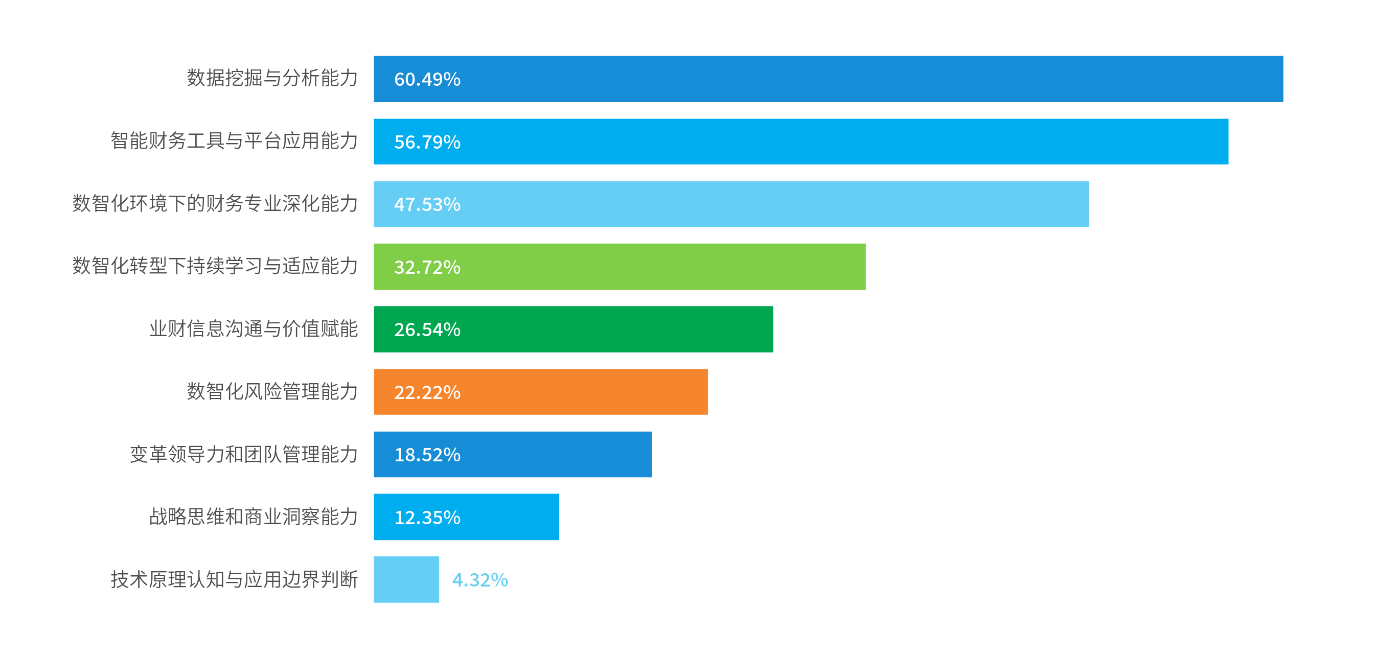 企业对财务团队能力的需求正发生根本性转变:调研显示,60.49%的企业将“数据挖掘与分析能力”视为最亟需提升的素质,56.79%的企业强调“智能工具应用能力”,47.53%的企业关注“专业能力在数智背景下的深化”。这一能力需求结构清晰地反映出财务角色的变化。财务人员需要能够利用数据分析工具挖掘业务规律,并具有专业判断力。新的财务能力要求对人才的教育背景、知识结构和持续学习提出了挑战,这也预示着未来财务组织价值创造方式的变化。