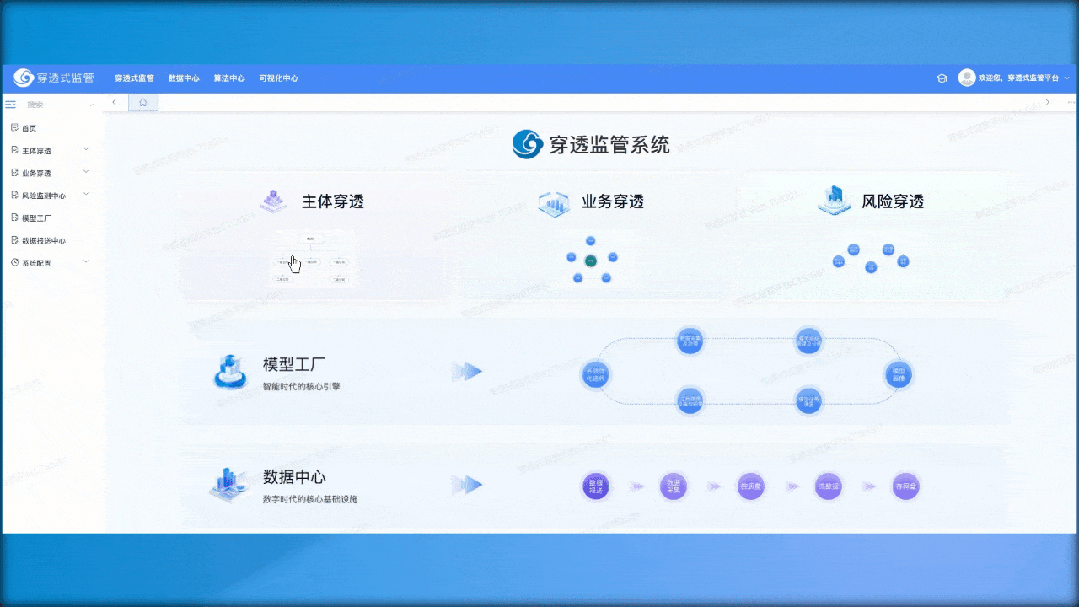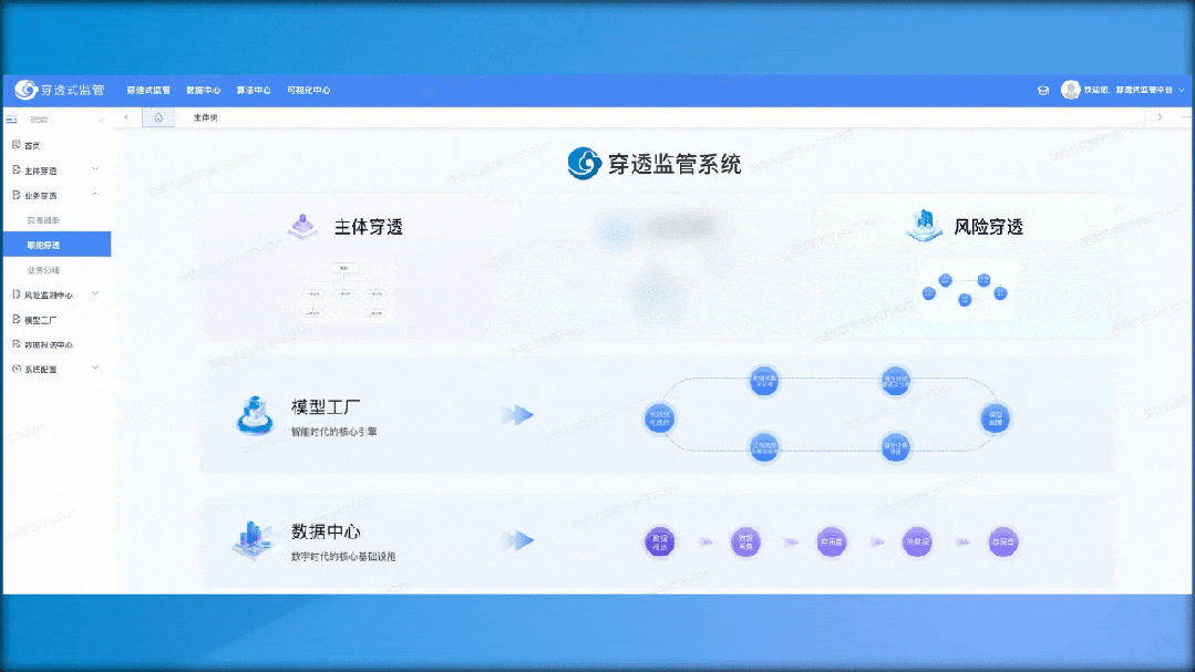 中兴新云穿透监管系统以主体穿透、业务穿透、风险穿透为主线,依托数据中心、算法中心、可视化中心、AI及图数据库等核心能力,助力企业实现主体全级次可穿透、生产要素关联下钻、风险全流程闭环的穿透监管目标,全面提升企业数据治理效能、业务洞察能力、风险识别与应对效率,推动穿透式监管体系落地。