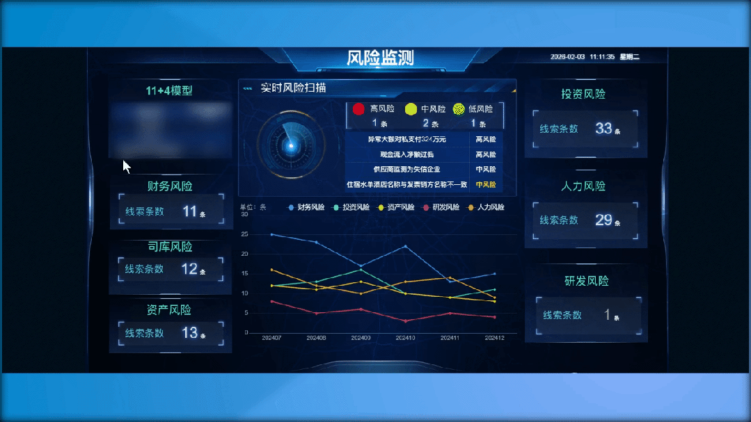 系统支持多维数据联动分析,既能从宏观总量层层下钻到合同、项目、款项用途等业务明细,也能通过知识图谱呈现资金、合同等关联网络,自动串联上下游交易链条,准确识别虚假贸易、循环交易等隐蔽风险,实现风险的全方位、多层次可视化展示;同时依托数据聚合技术,实现实时数据接入与历史数据回溯,形成动态更新的时空数据资产,为企业持续的经营分析与风险防控提供可靠的数据支撑与决策依据。