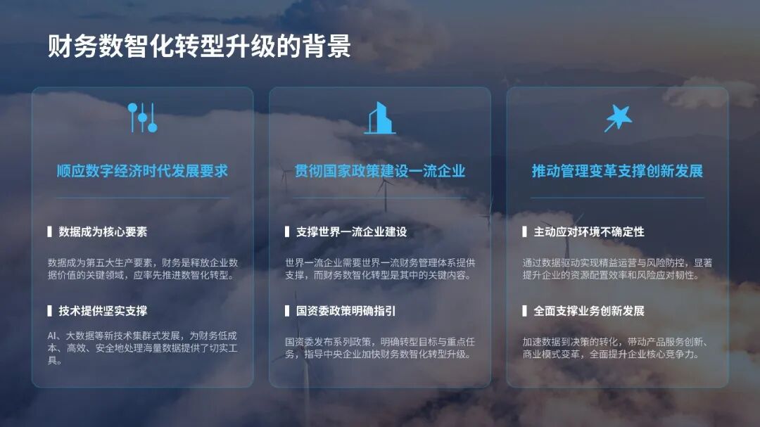 数字经济正在成为重组全球要素资源、重塑全球经济结构、改变全球竞争格局的关键力量,以人工智能、大数据、云计算、区块链为代表的新兴技术,正在改变企业经营管理的底层逻辑。面对高度不确定性的市场环境和日趋激烈的竞争压力,企业对财务的响应速度、决策支撑效能和风险预警水平等方面提出了更高要求。在管理需求升级与技术革新双重驱动下,国有企业加快财务数智化转型,推动新兴技术与业务场景深度融合,变革财务工作方式、提升数据管理能力并释放数据价值,不断拓展财务职能边界,以提升运营效率、优化资源配置、强化合规风控,并更好支持业务运营与管理决策,为建设世界一流企业、实现高质量可持续发展提供坚实支撑。