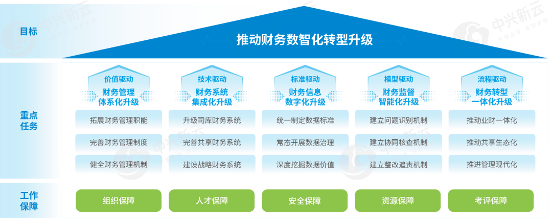 此次,政策层面明确提出,财务数智化转型升级的核心任务可概括为“五个驱动”与“五个升级”: